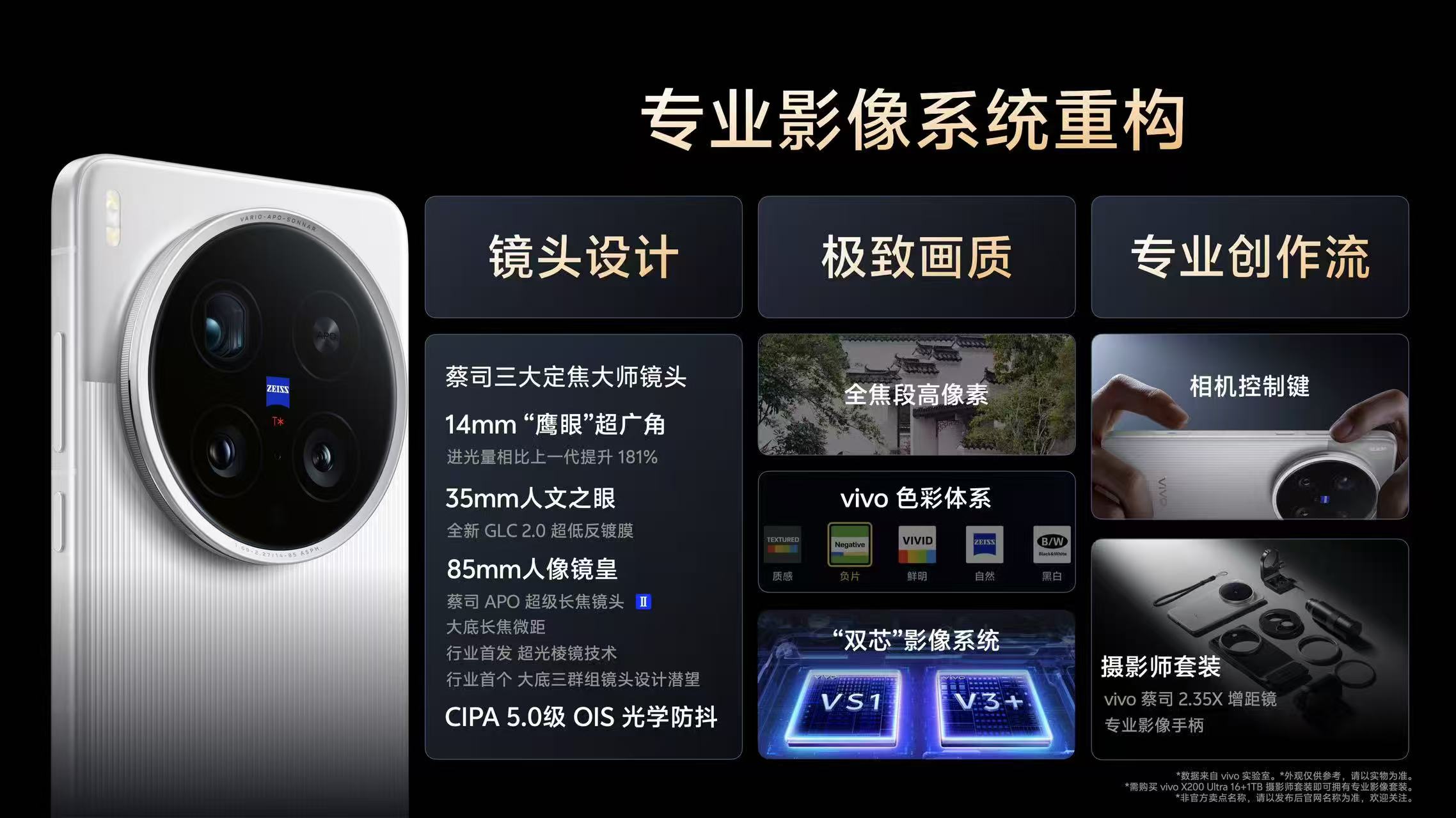 vivo的蓝图影像品牌涵盖了自研蓝图传感器技术、自研蓝图影像芯片,以及自研蓝图算法矩阵。此次发布的vivo X200 Ultra采用蔡司三大定焦大师镜头及行业首创的蓝图影像双芯,打造移动影像“全能V单”。从光学重构到双芯影像,从视频创作到未来影像,从算法到用户体验,vivo构建了一套完整的影像技术方案体系。