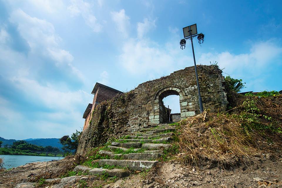 在旧南城门城墙脚与锦江河岸边至东城门至今还留存一条一百多米的古驿道,东城门外条石阶梯连接古驿道和码头。图为恩村东城门遗址。
