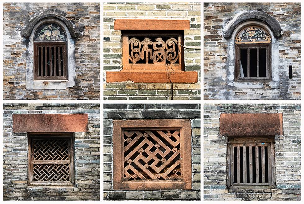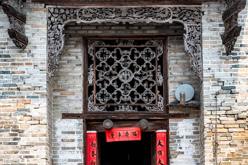 民居有丹霞红砂岩“福”、“万字不到头”石雕漏窗,有木格栅式、卷轴样式花草彩绘等几何图案的窗花,设计精巧,寓意深远。