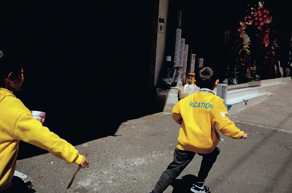 拿着碗筷追逐嬉戏的孩子 万汇洲 摄