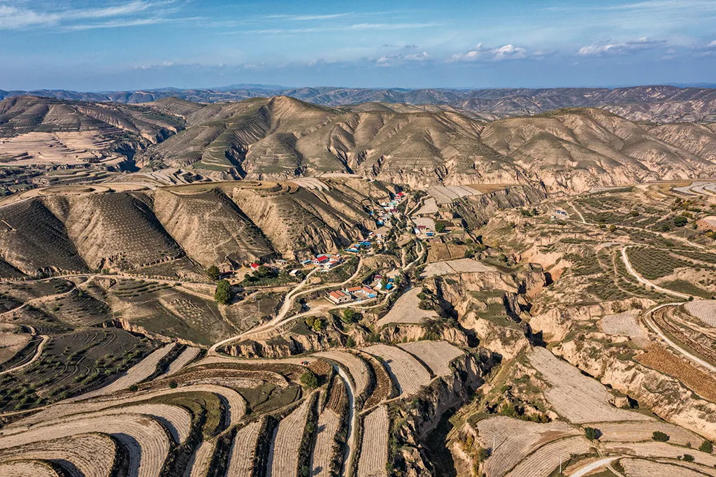 山沟里的村庄梯田环绕,道路硬化。2021年10月,拍摄于宁夏固原官亭镇。 李刚 摄