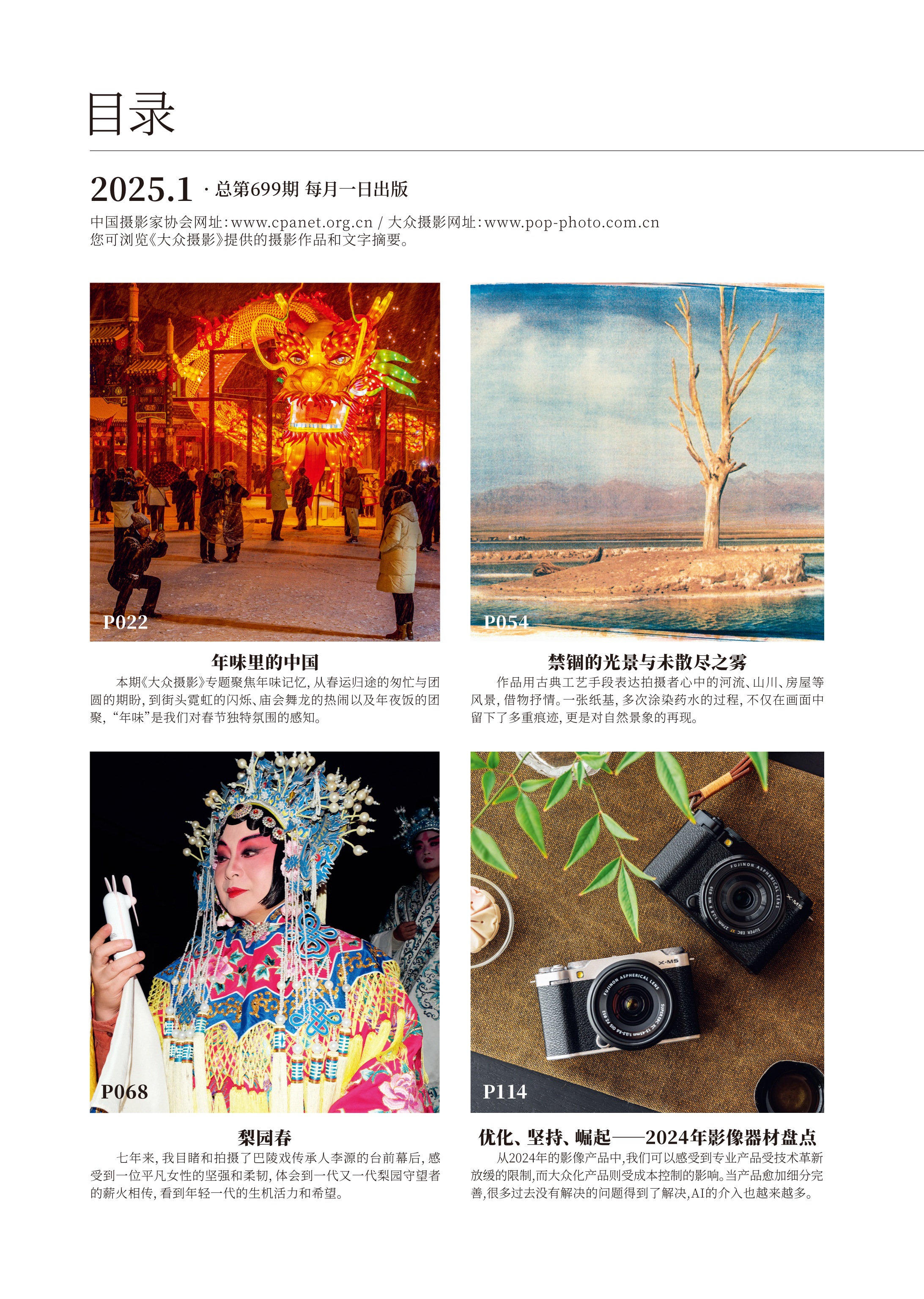 大众摄影2025年第1期 2025-01-01 相关文章 大众摄影2026年第4期2026-03-27大众摄影2026年第3期2026-02-28大众摄影2026年第2期2026-01-27大众摄影2026年第1期2025-12-30大众摄影2025年第12期2025-11-28 杂志MAGAZINE微店淘宝APP下载