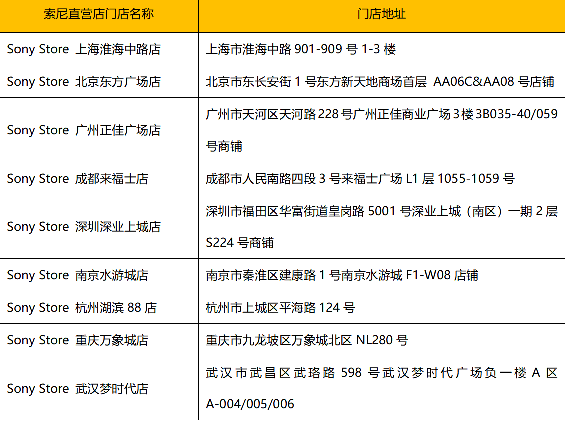 更多实时动态,敬请关注索尼中国在线商城(https://www.sonystyle.com.cn/)、索尼影像圈官方微博(http://weibo.com/diclubsony)或索尼中国微信公众号(微信号:sonycn_001)和索尼影像圈官方微信公众号(微信号:sonycn_002)或垂询以下门店。