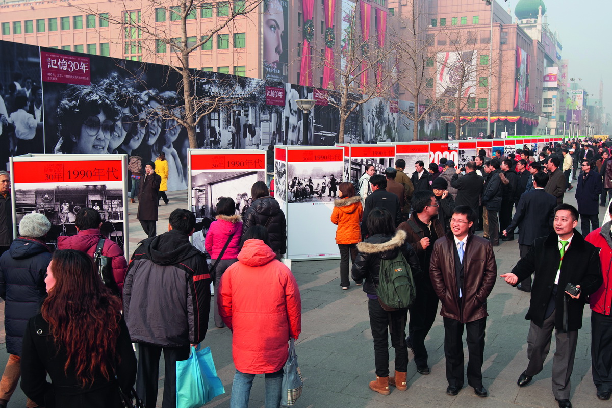 王府井大街是中国著名的商业街之一,日客流量可达60万人,节假日超越120万人。2008年12月中国摄协和广东长安镇在此举办纪念改革开放30年全国摄影大展,这是被誉为北京“金街”的步行道上第一次举办大型摄影活动。 唐寿新 摄